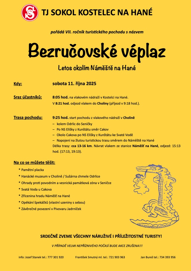TJ Sokol Kostelec na Hané pořádá v sobotu 11.10.2025 tradiční turistický pochod, který nás letos provede okolím Náměště na Hané.Sraz účastníků v 8.05 hodi na vlakovém nádraží v Kostelci na Hané. V případě nepříznivého počasí bude akce zrušena.