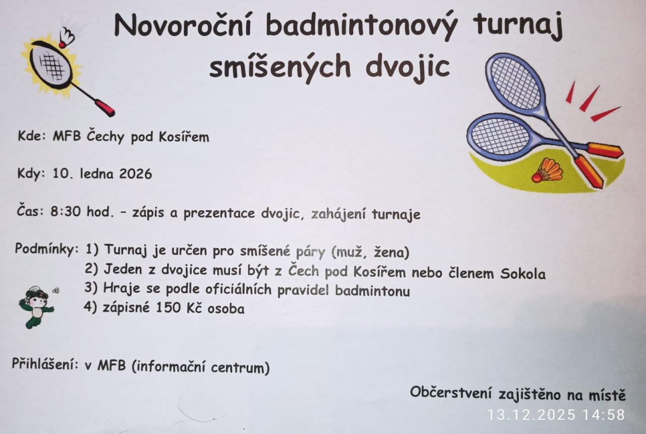 TJ Sokol srdečně zve na Novoroční badmintonový turnaj smíšených dvojic, který se uskuteční v sobotu 10. ledna 2026 od 8.30 hod. v MFB v Čechách pod Kosířem.